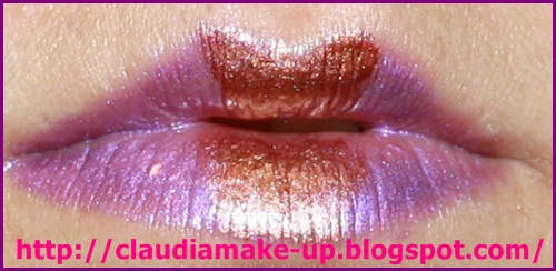 Como la inspiración estaba de mi lado me animé a dar color a mis labios pero no algo discretito ni mucho menos.... utilicé los mismos tonos que para el look de ojos, el dorado vuelve a ser protagonista dando unos toques en el centro de los labios.
